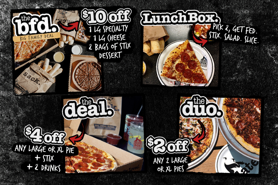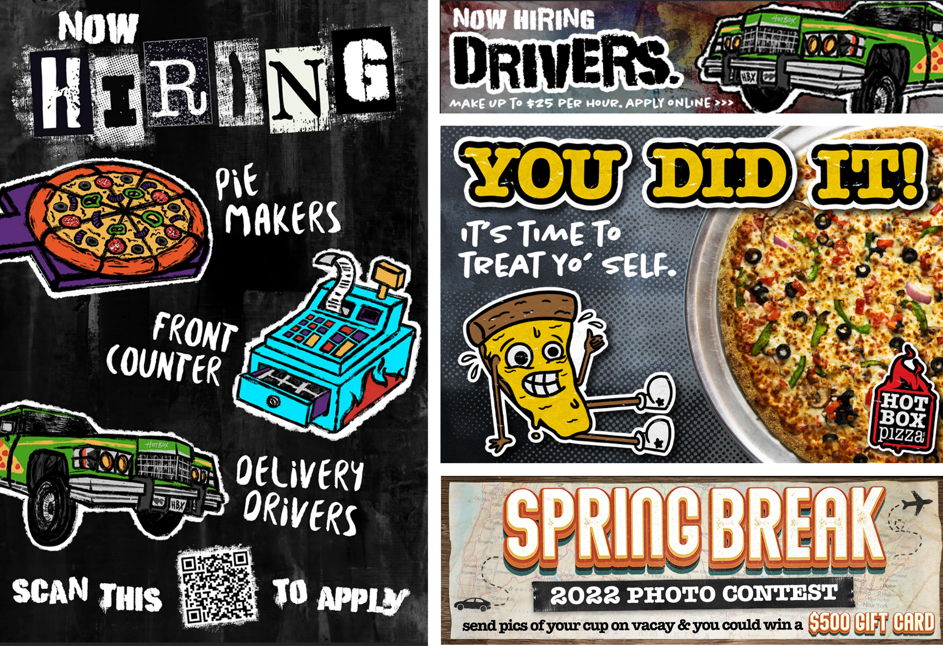 I had the opportunity to create a wide range of advertisement and brand design work for HotBox Pizza, including BoxTops (postcard-sized ads used on all pizza boxes), digital advertisements, social media graphics, and in-store print materials. Each design was crafted from scratch, featuring my own illustrations and handmade graphics to reflect HotBox's unique personality and brand. From concept to completion, I handled every aspect of the creative process, ensuring each piece aligned with their bold, playful identity.